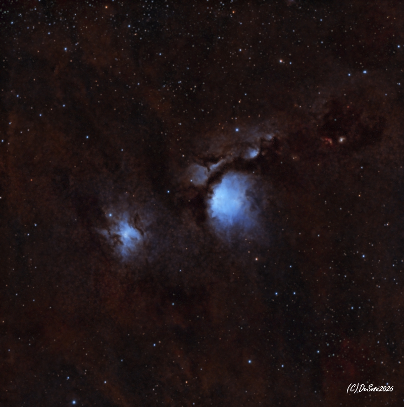 La nube de polvo de la nebulosa refleja la luz de sus dos estrellas centrales, lo que la hace visible. Las observaciones infrarrojas revelan un cúmulo estelar incrustado y una jerarquía de cúmulos de gas con masas centrales que oscilan entre 0,3 M☉ y 5 M☉.