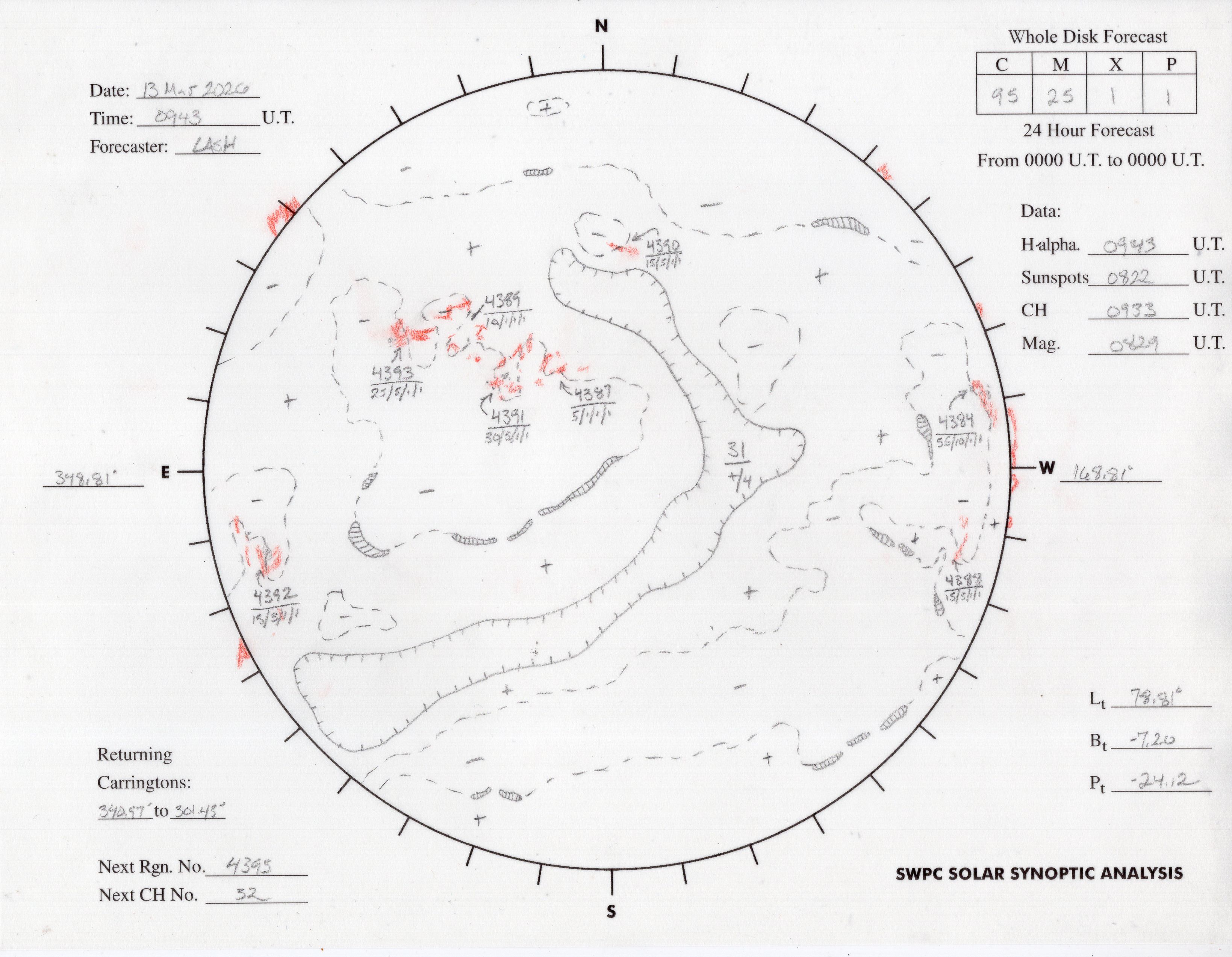 Las grandes estructuras de campo magnético con una polaridad magnética presentan una "línea neutra" en el límite de las diferentes polaridades magnéticas de los campos. Las líneas neutras se asocian con erupciones en regiones activas, y los filamentos/prominencias suelen estar asociados con las líneas neutras en un Sol en calma. Las líneas neutras aparecen como líneas discontinuas en los dibujos sinópticos y el pronosticador indica la polaridad del campo magnético a ambos lados de la línea neutra con signos + (positivo) y - (negativo).