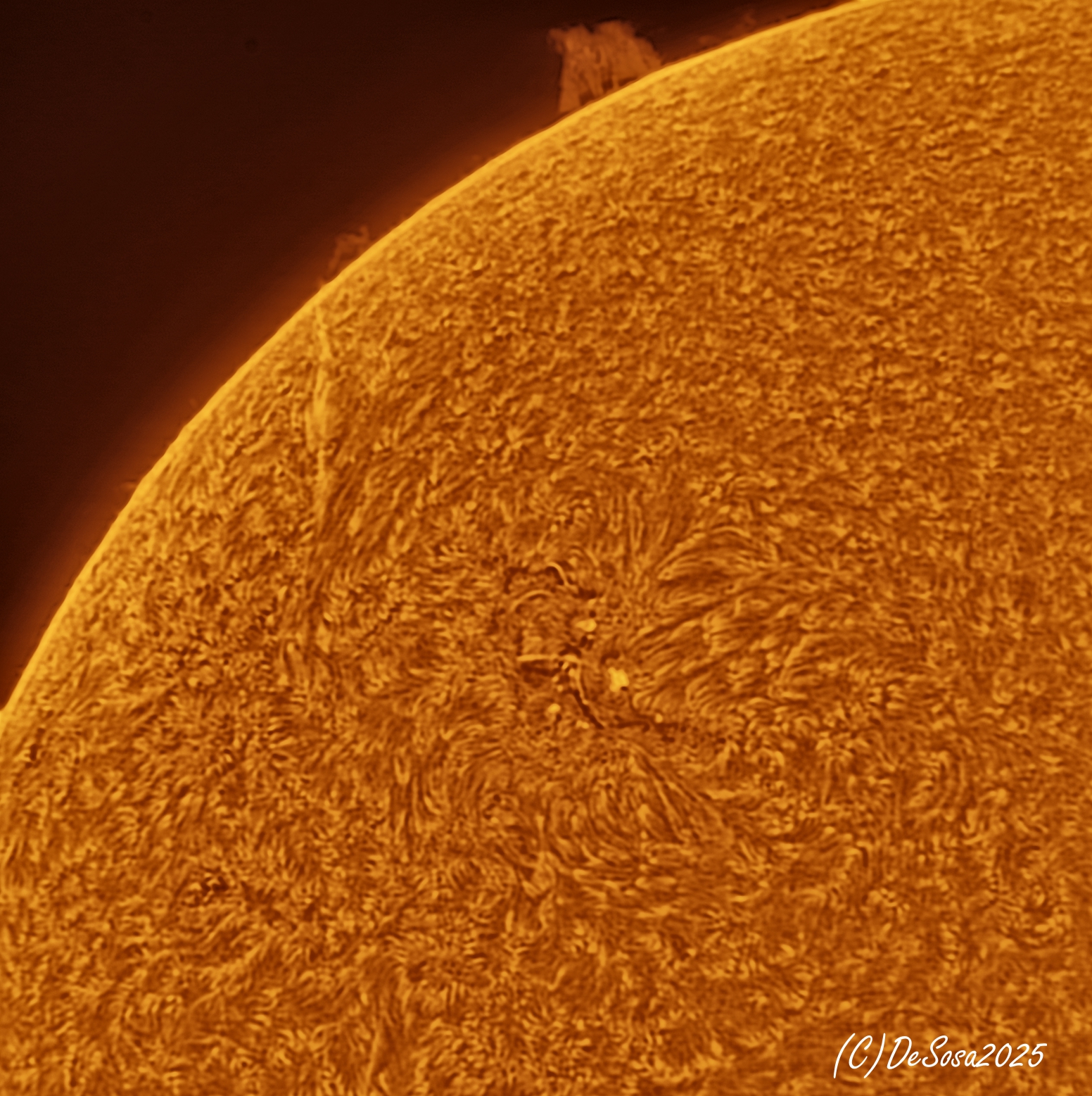 NEVER LOOK THROUGH A TELESCOPE OR BINOCULARS TO POINT AT THE SUN. Partial or total irreversible blindness result. This picture have been taken using a special type of telescope designed to be safe observing the Sun.