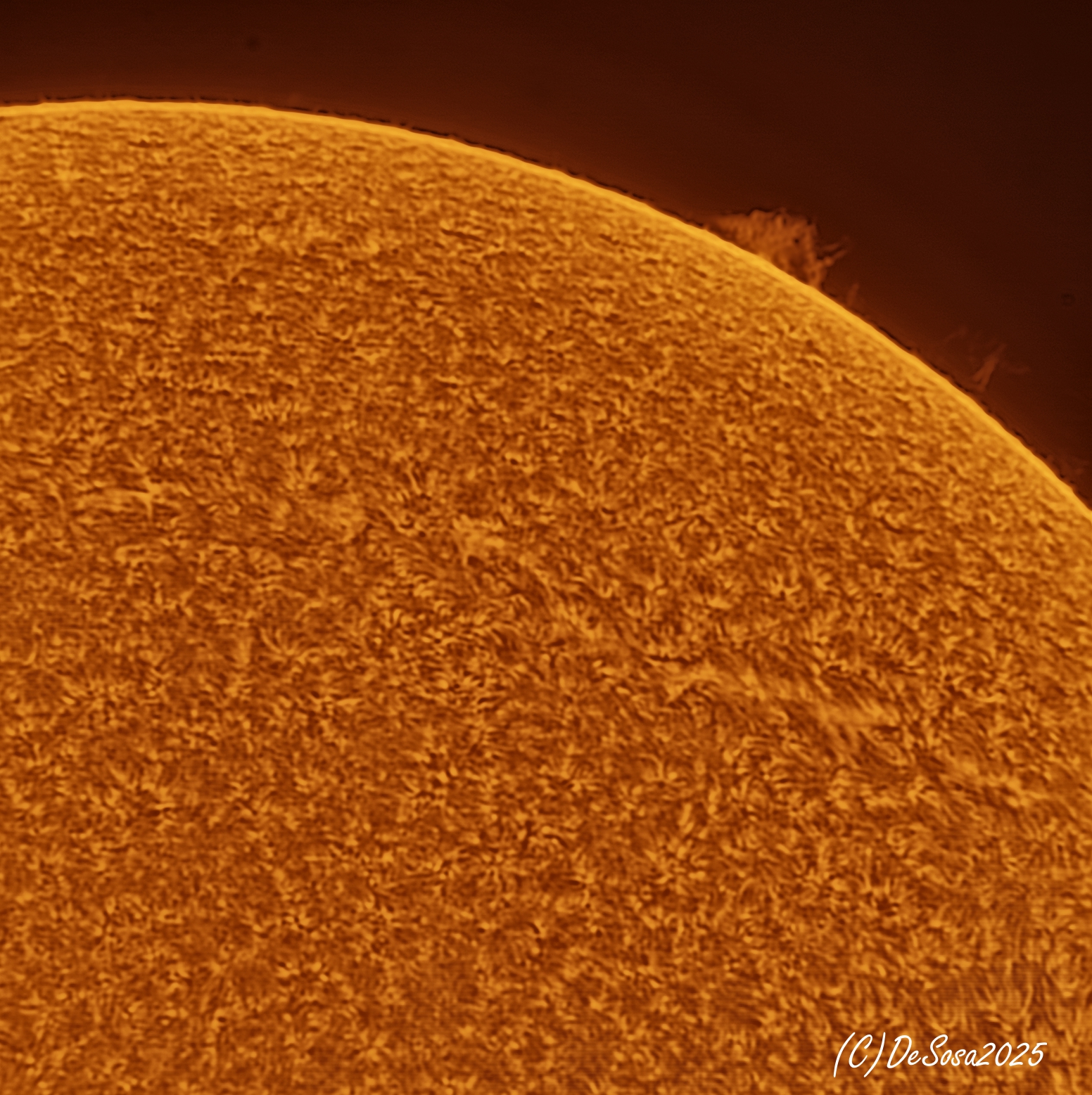 Es posible tomar fotografías de la cromosfera utilizando telescopios especiales capaces de filtrar estrechamente la línea espectral Ha, como en esta imagen.